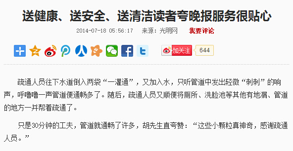 只是30分钟的工夫,管道就通畅了许多,胡先生直夸赞:“这些小颗粒真神奇,感谢疏通人员。”