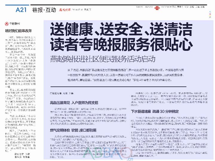 从7月起,石家庄一灌通携手燕赵晚报启动“进社区便民服务活动”,第一站走进了卓达书香园小区。活动还特邀石家庄市第一医院医生、新奥燃气公司检测人员与一灌通石家庄公司工作人员共同组成便民服务队,为居民检查身体、检测燃气、清洁管道。