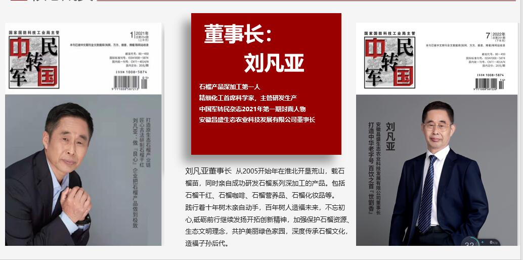 安徽昌盛生态农业科技发展有限公司旗下所研制开发的石榴干红系列产自中国淮北塔山软籽石榴基地。中国淮北塔山软籽石榴基地是全国六大石榴基地之一,己通过安徽省标准化石榴基地验收,2007年在全国林业博览会获得金奖,畅销全国各地。2012年塔山石榴干红获得国家质检总局专家组全票通过。石榴系列深加工,目前唯一一家(石榴干红、石榴咖啡、石榴籽精油等等)。