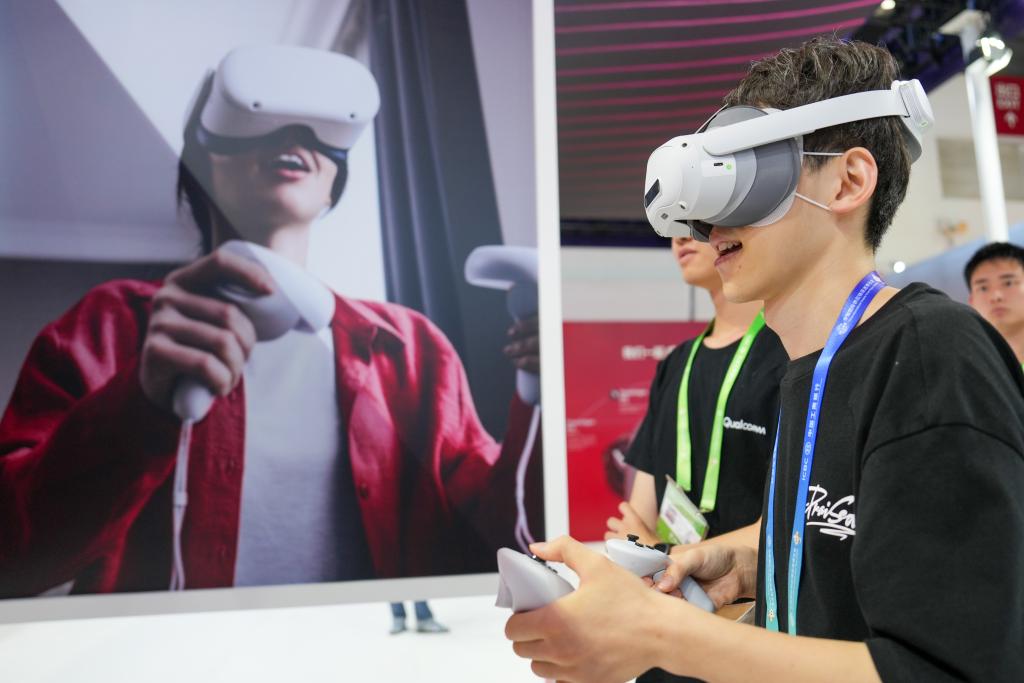 【7月17日,参观者在数字科技链展区高通展台体验搭载了高通公司芯片的产品。新华社记者鞠焕宗摄】
