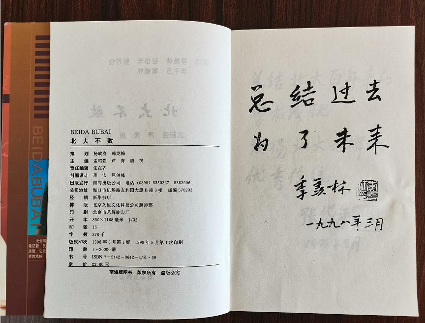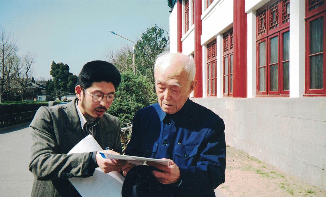 1998年3月,北京大学100周年校庆前夕,《北大不败》主编孟昭强拜访著名文化大师、北京大学教授季羡林先生,特邀季老师担任《北大不败》编委会顾问并为该书题词。照片拍摄地点:北京大学西校门内·季老师办公楼前;拍摄者:CCTV《人类的敦煌》摄制组工作人员。