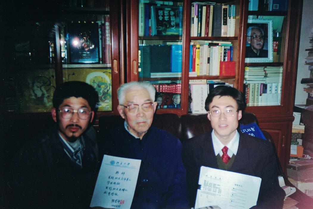 1998年3月,北京大学100周年校庆前夕,《北大不败》主编孟昭强(左)、副主编李树丛(右)拜访著名哲学家、哲学史家、北京大学教授张岱年先生,特邀张老师担任《北大不败》编委会顾问并为该书题词。照片拍摄地点:北京大学中关园·张老师家中;拍摄者:张老师的家人。