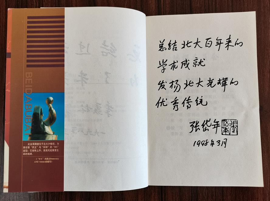 张岱年先生为《北大不败》一书题词:总结北大百年来的学术成就,发扬北大光辉的优秀传统 !