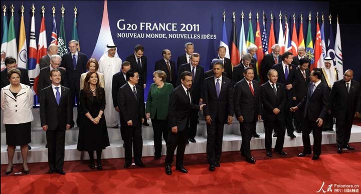 当天中午12时30分许,雨后的戛纳电影宫会议中心,二十国国旗迎风飘扬,盛装礼兵列队以待。本次峰会东道主、法国总统萨科齐站在红毯中央,与陆续前来的中国国家主席胡锦涛、美国总统奥巴马、俄罗斯总统梅德韦杰夫等二十国集团领导人握手合影。随后,峰会在会议中心的全会厅举行,各国领导人共商应对风险挑战、推动世界发展大计。