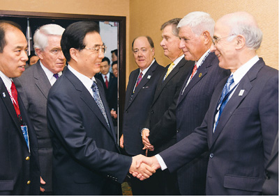 11月10日,国家主席胡锦涛在美国檀香山会见美国工商界代表。新华社记者黄敬文摄