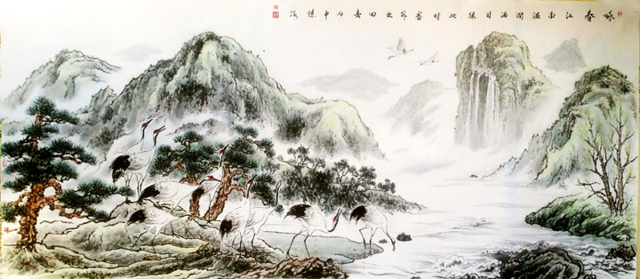 陈冰笔下的丹顶鹤传承古法,意境超脱,其中景与自然融会贯通,超拔中彰显宁静与祥和,深邃与凝重的巧妙融合,表现了其深厚的笔墨工底,达到了中国画传神的最高竟界。
