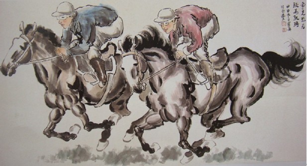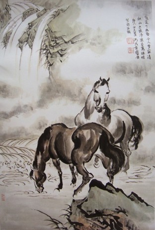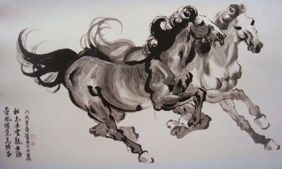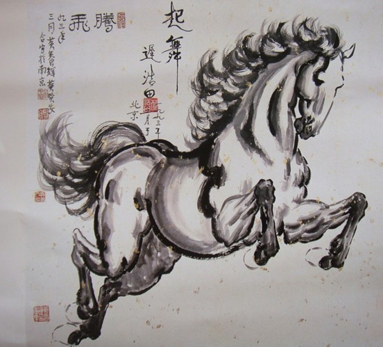 黄先生爱马,为马的驰骋飞腾勇往直前的气势所感动,为历代代画马大师笔下的神骏所启迪,承继先辈大师的画马成就、创造自己的画马艺术个性是黄先生的毕生追求。唐人韩干画马以真马为师为后人树立了“师造化”的榜样,悲鸿前辈教导弟子“画马不要学我,要以真马为师”。由此,黄先生十分重视对真马形态的观察与写生,抒写于马的各种情态传达。他在《奔马》一图中题:“不难上青天,只要有勇往直前克服万难的精神”。黄先生以悲鸿前辈为典范,以自己的思想与情感及人生哲理融化入骏马的灵魂之中。以自己对马的诠释来塑造马的意境。故黄先生笔下的马力求形态真实,在造型中十分重视马的解剖结构,着意描绘马所蕴含的无敌雄建之美。