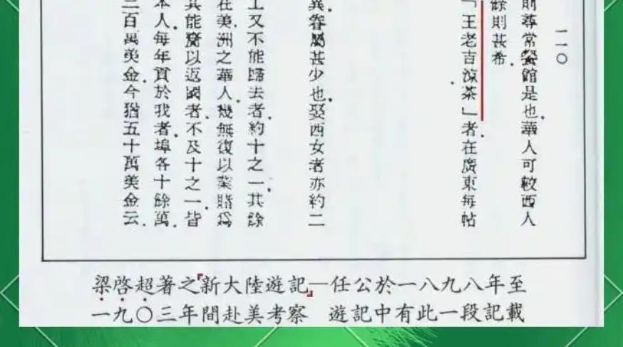 王老吉凉茶在19世纪末通过华人的海外传播走向世界,凡有华人之处,便有中国凉茶的清香。在1898年,大学者梁启超赴美考察后,在《新大陆游记》中记载道:“有所谓‘王老吉凉茶’者,在广东每贴铜钱二文,而售诸西人,或值五元十元美金不等。”这表明在中国本土仅需两文铜钱的王老吉,在美国竟能卖到5至10美元的高价,堪称当时的海外“奢侈品”。